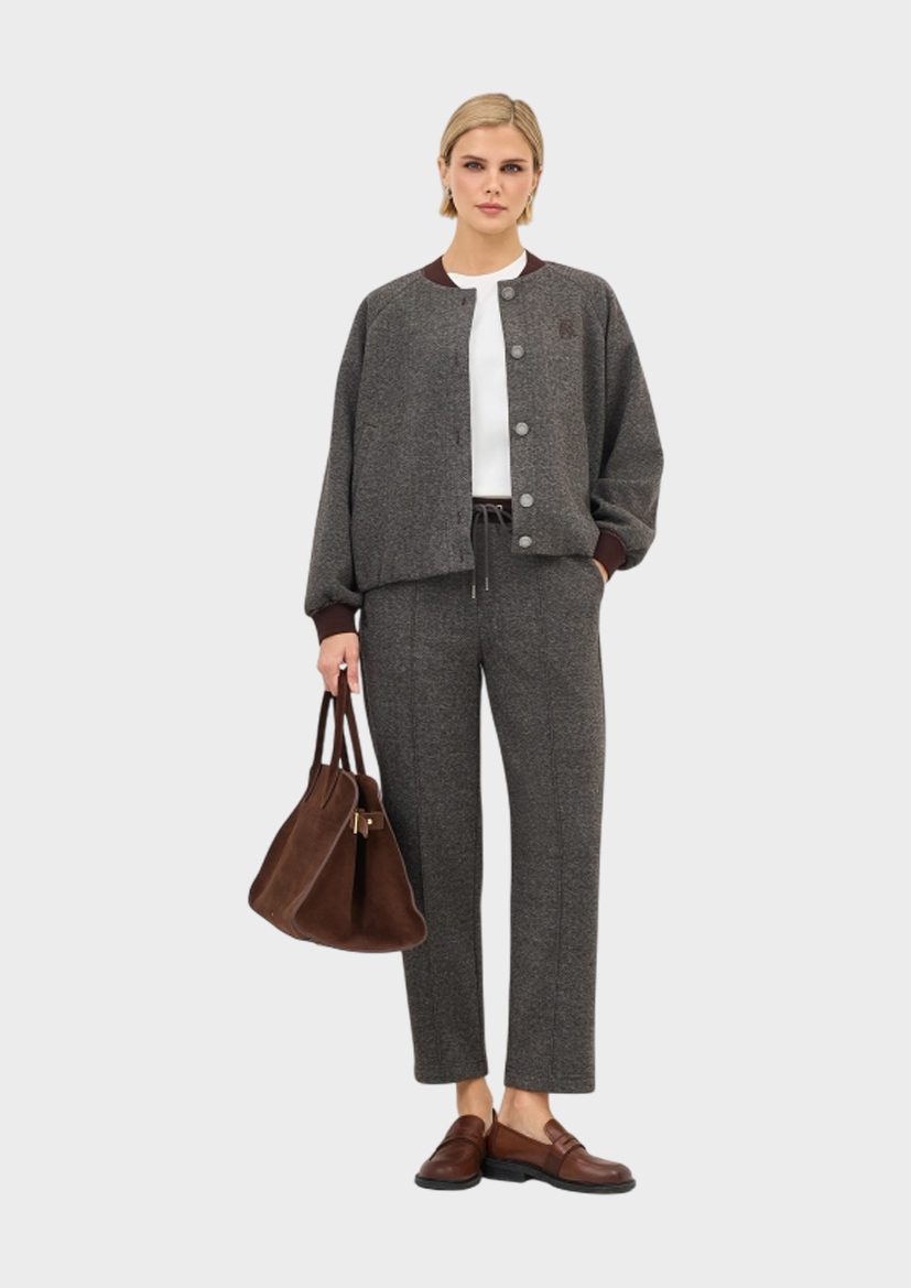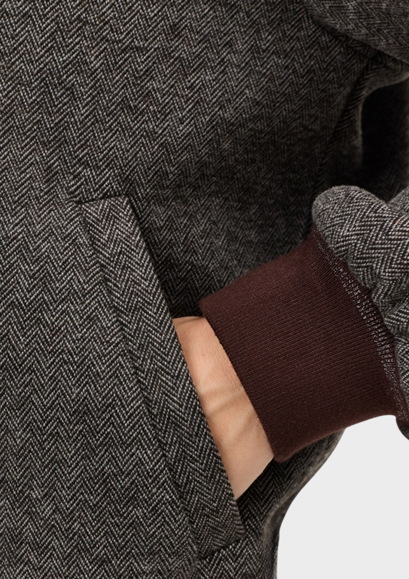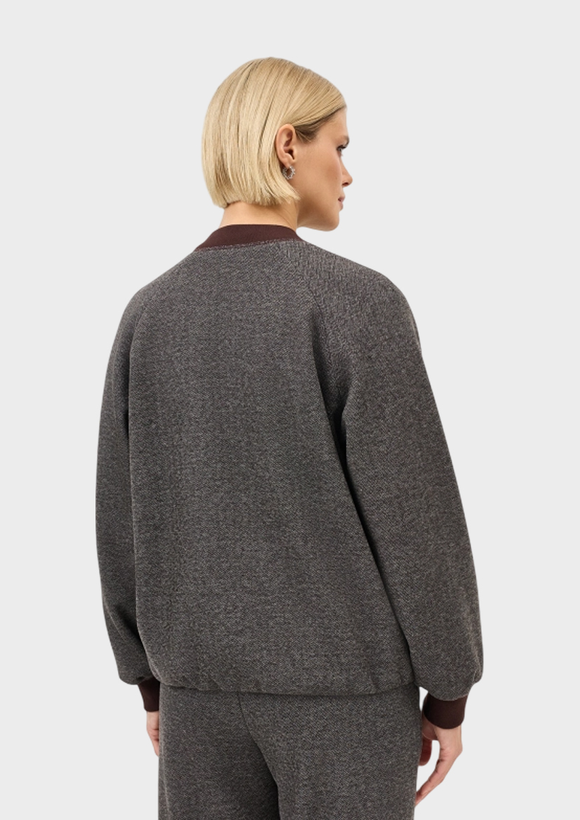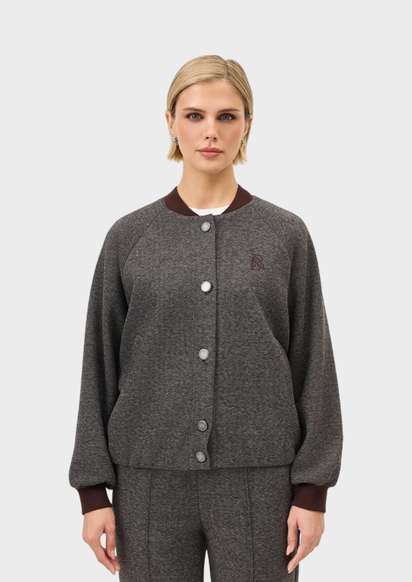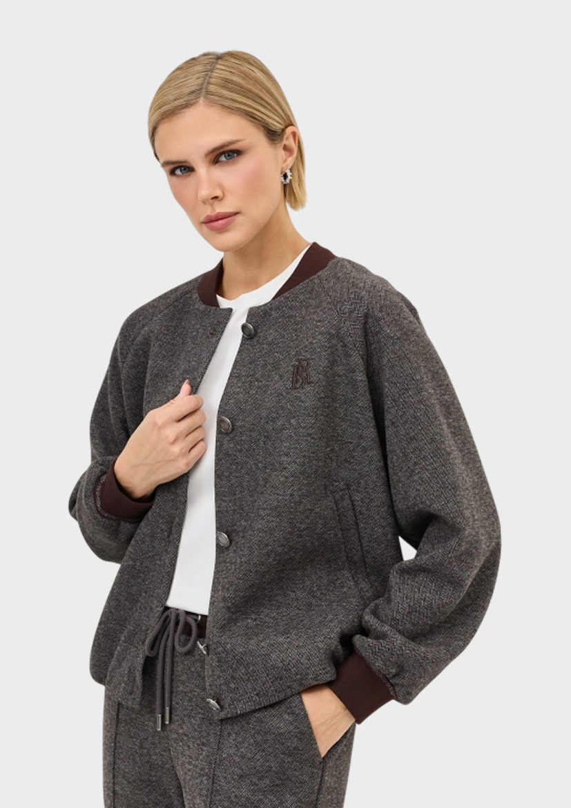 Бомбер из теплого трикотажа с шерстью в составе. Контрастный воротник стойка. Застежка на брендированные кнопки. Длинные объемные рукава реглан дополнены контрастными манжетами. В составе шерсть. Комплект с арт. 5257825.