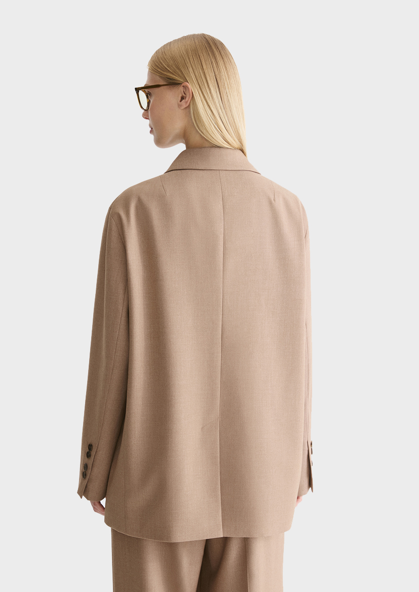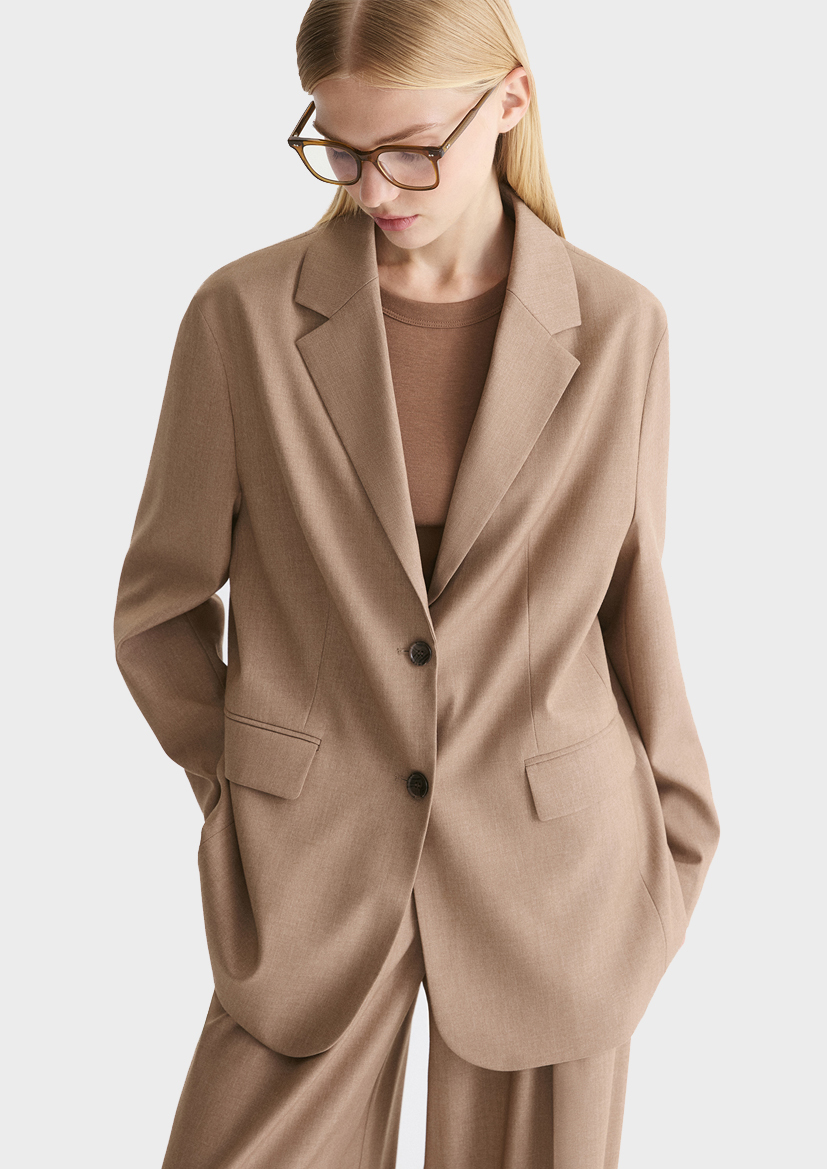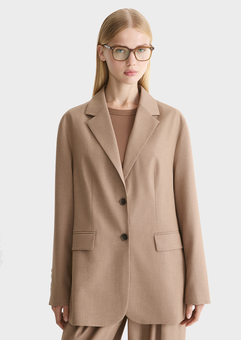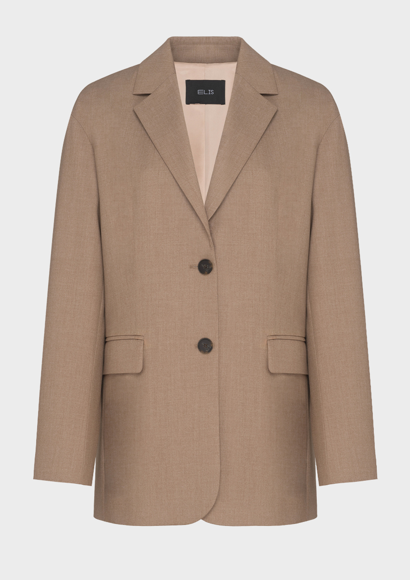 Однобортный пиджак в оттенке кэмел - маст-хэв демисезонного гардероба. Прямой силуэт, достаточная длина и мягкое неформованное плечо создают эффект оверсайз, комфортный и актуальный.