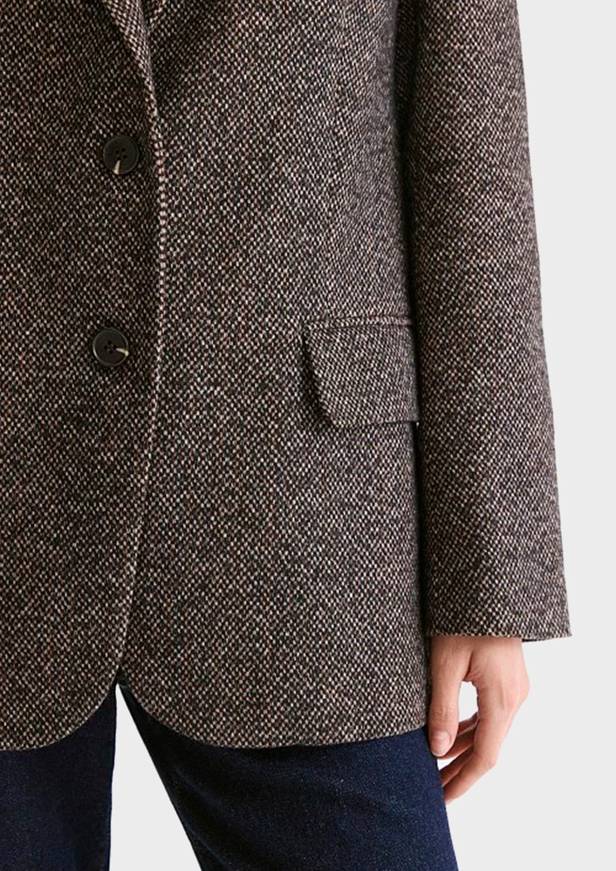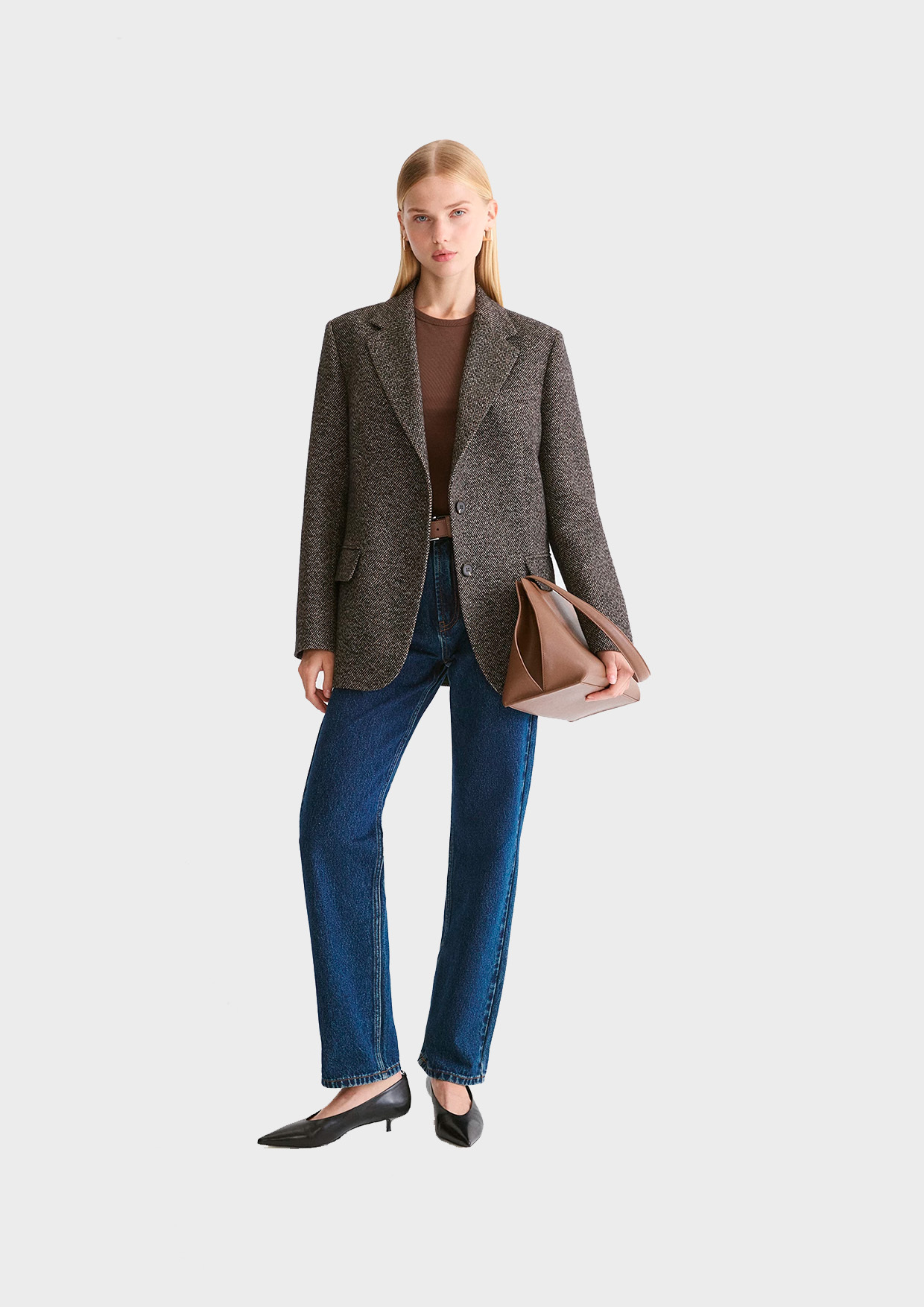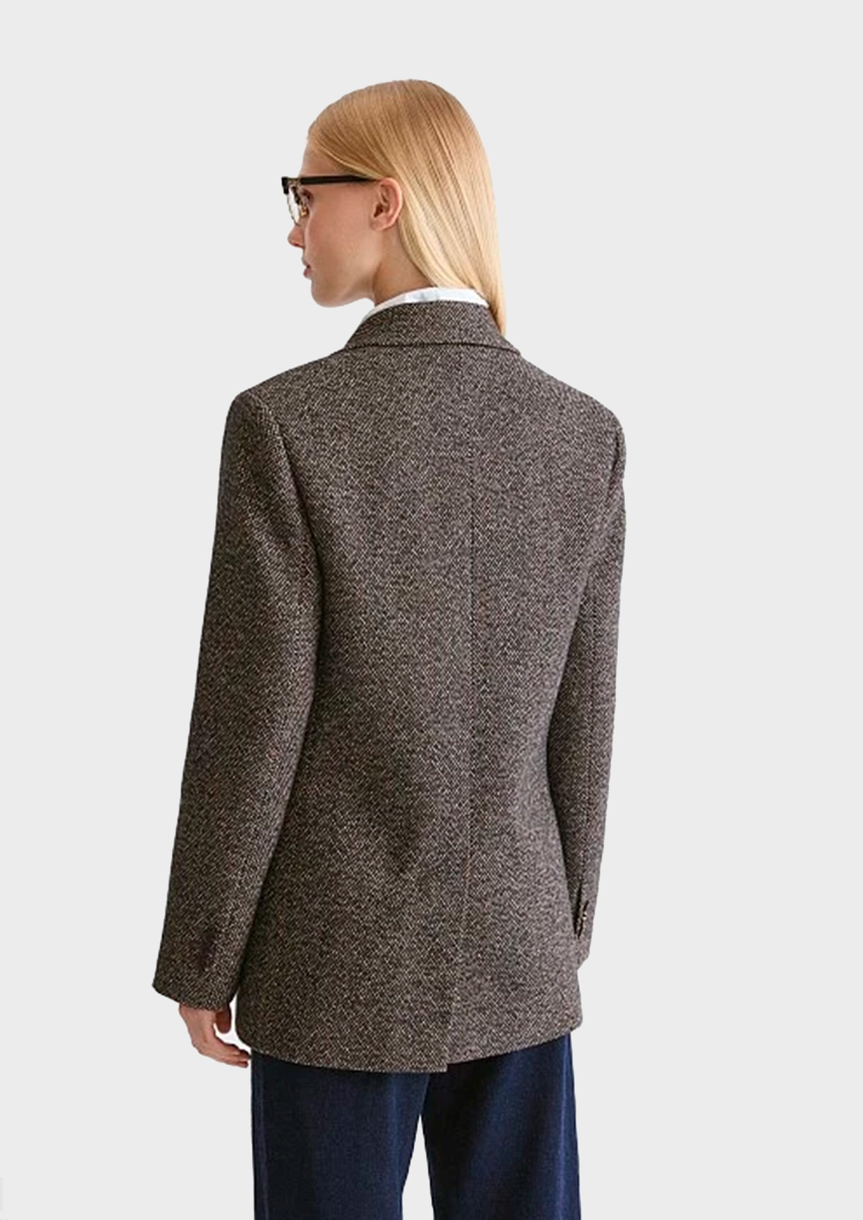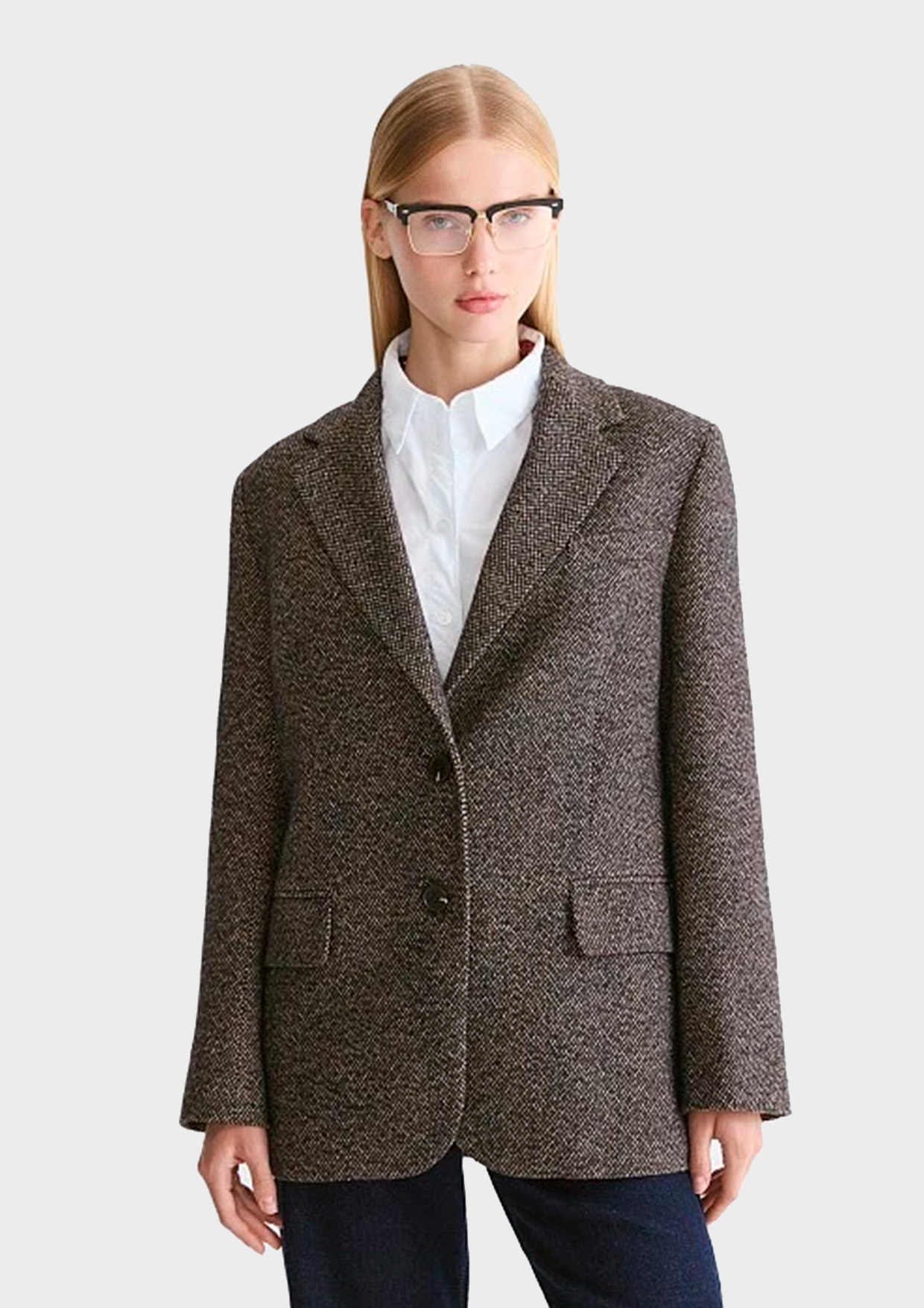 Осенний длинный жакет из шерстяной ткани на поливискозной подкладке способен заменить короткое пальто. Классический прямой жакет с английским воротником, карманами с клапанами, втачным рукавом и шлицей стилистически напоминает мужской пиджак. Если подобрать размер на один-два больше обычного, можно сформировать актуальный силуэт оверсайз.
