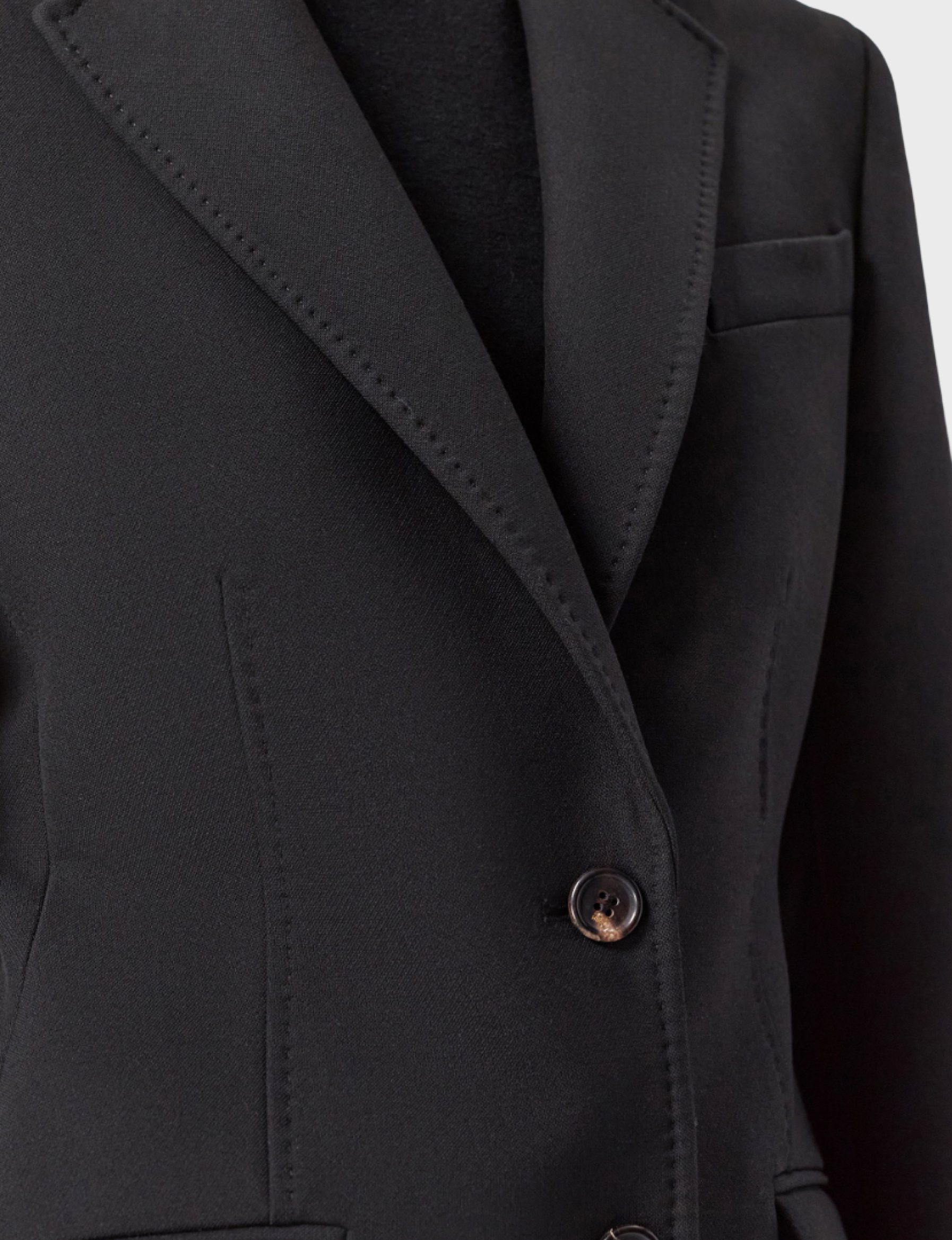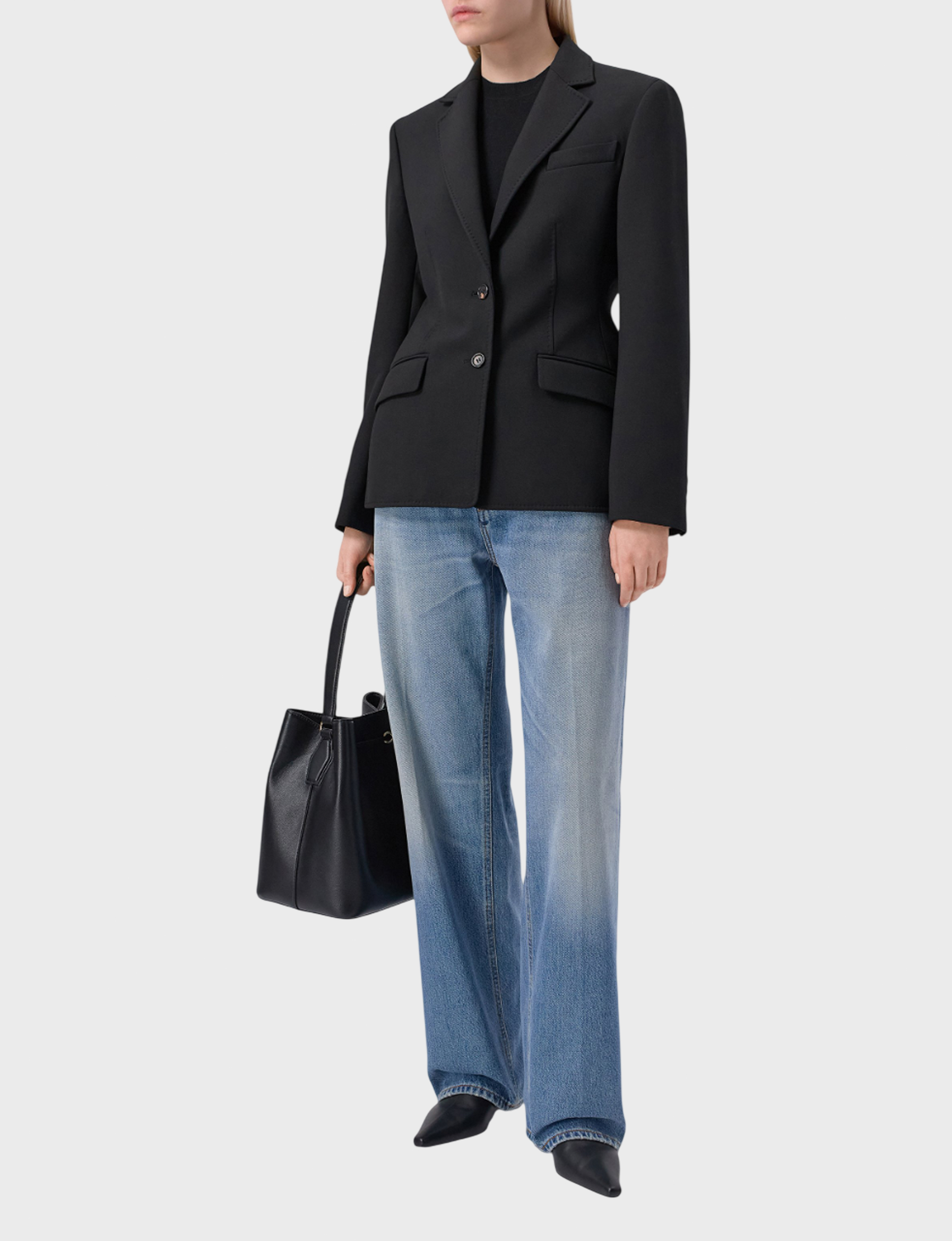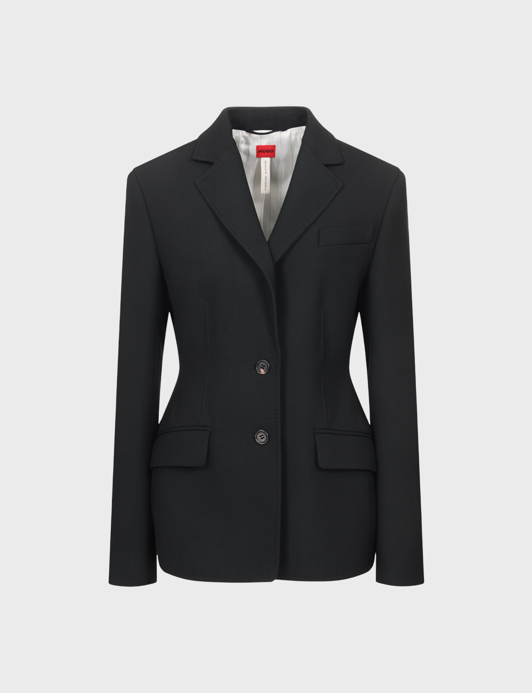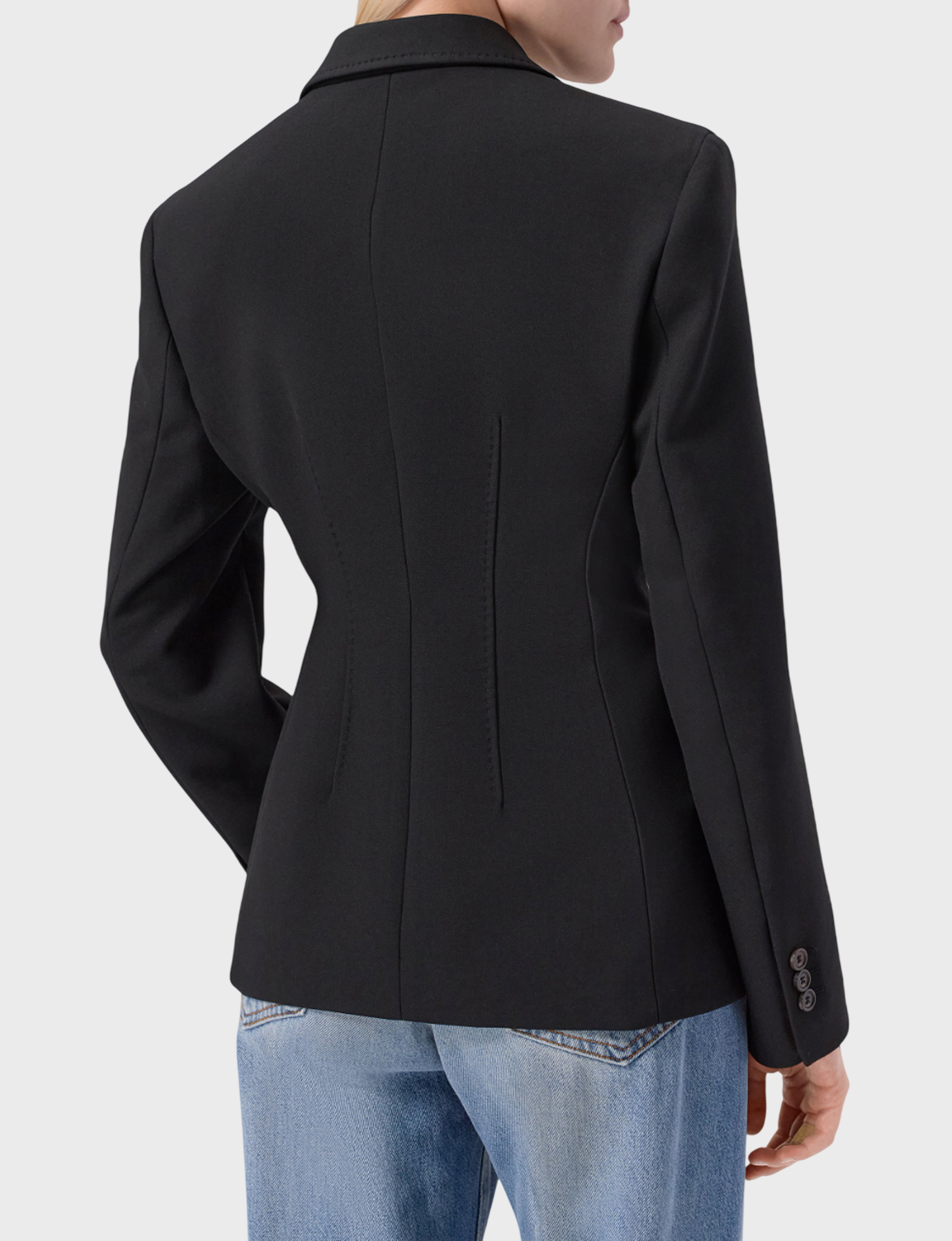 Приталенный жакет Anelora на роговых пуговицах выполнили из стрейчевого твила на основе полиэстера и вискозы. Модель с атласным подкладом в полоску дополнили нагрудным и боковыми карманами.