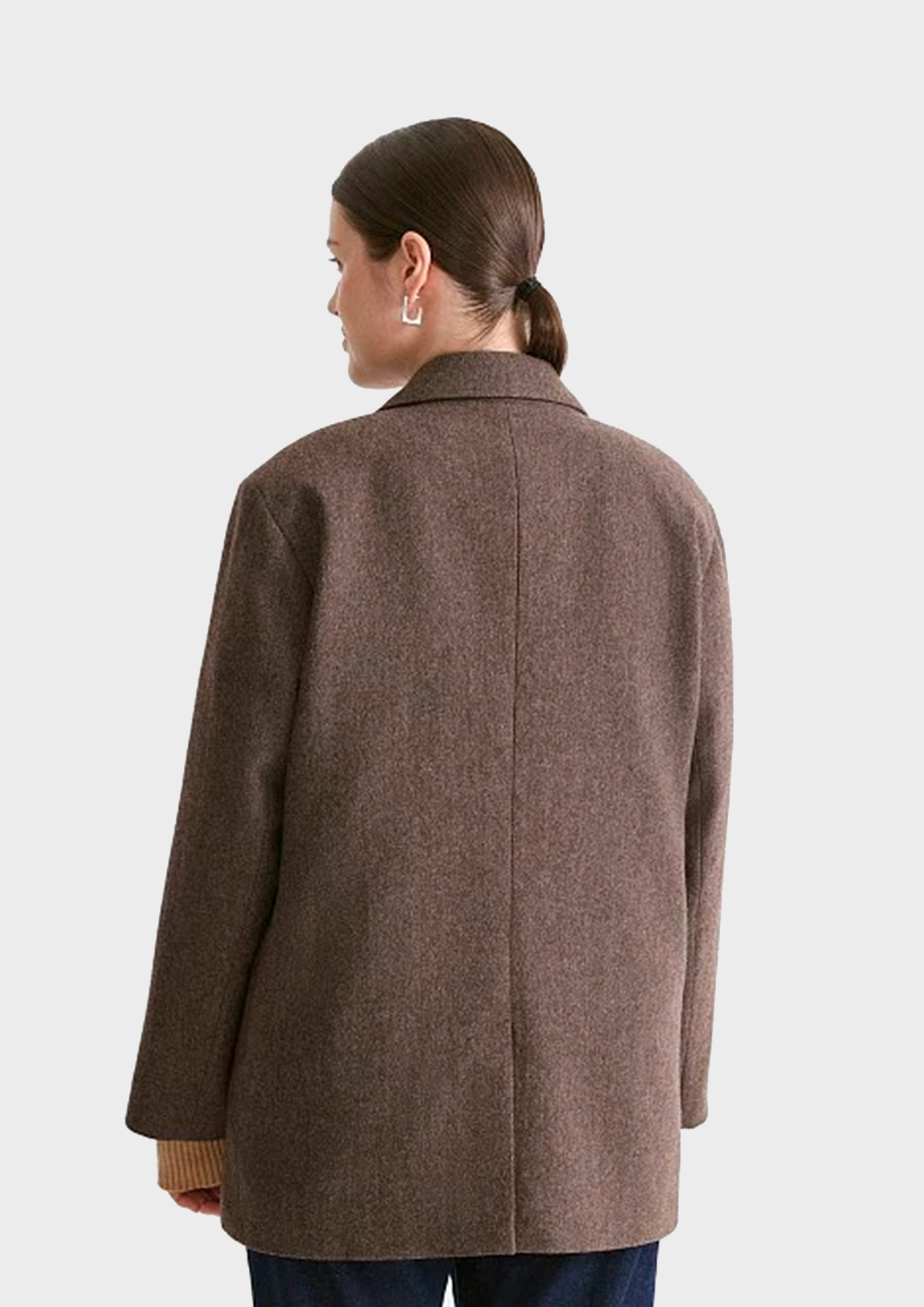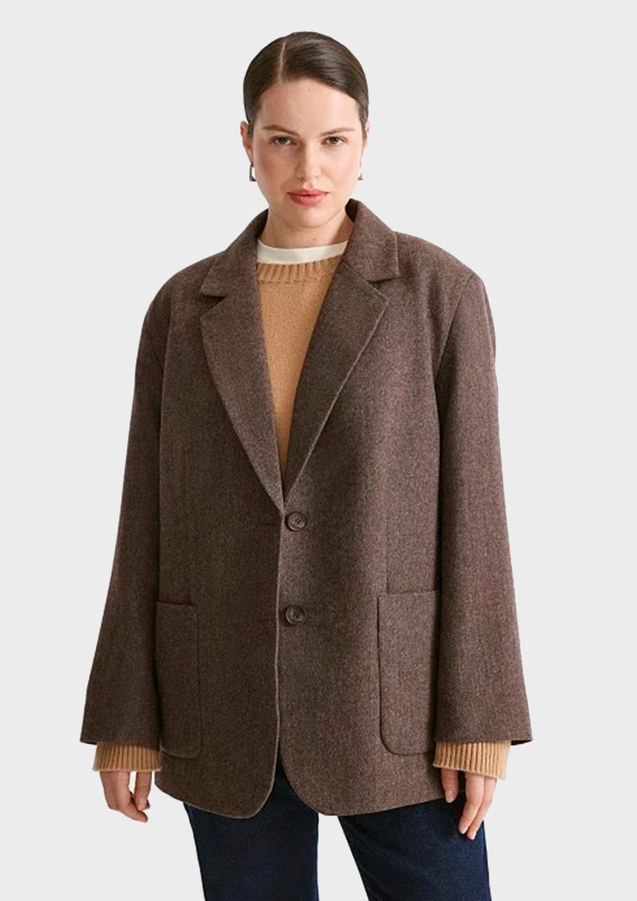 Классический пиджачный воротник с выразительными лацканами и вертикальные вытачки создают стройный силуэт. Практичные накладные карманы и шлица сзади добавляют удобства, оставаясь лаконичными.