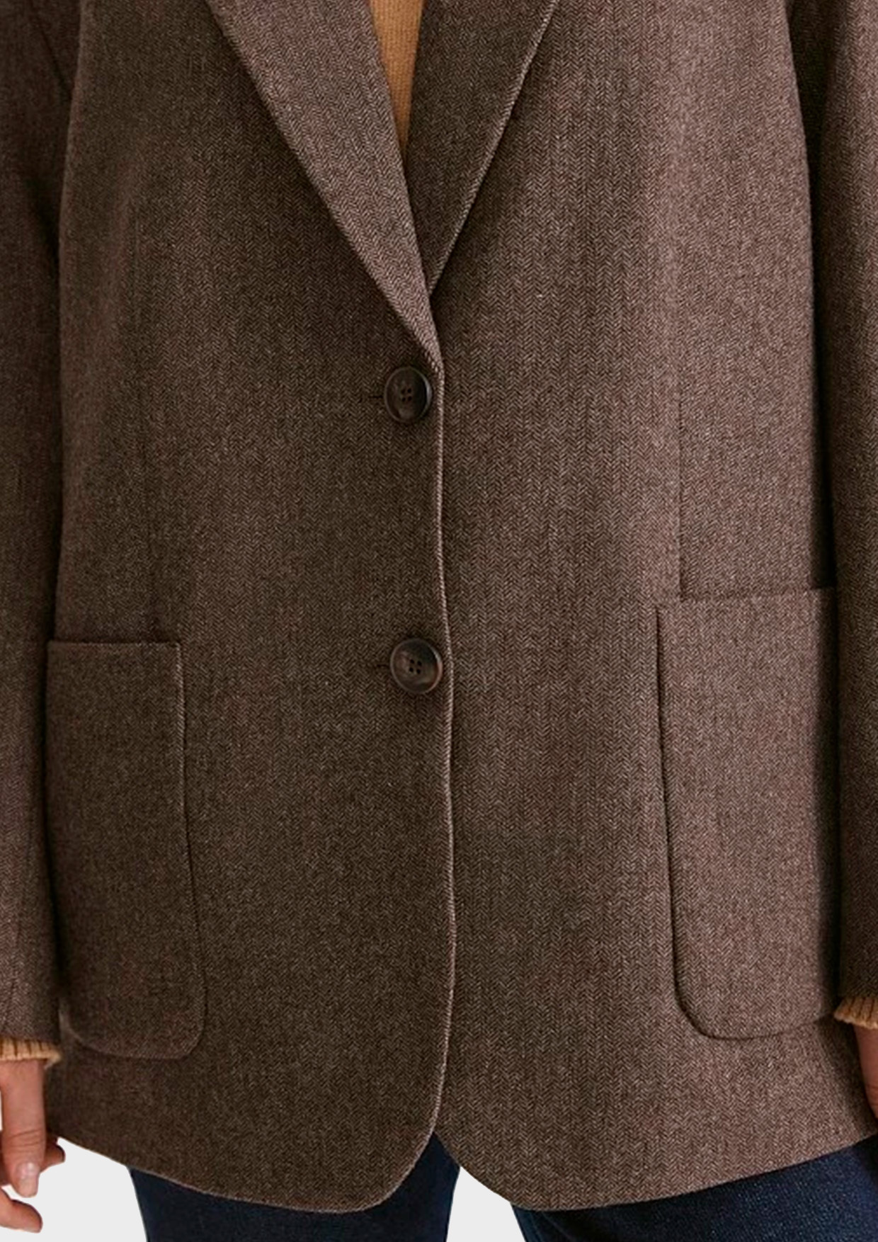 Теплый жакет в элегантную елочку - универсальная вещь, которая легко заменит и пиджак, и лёгкое пальто. Сшит из благородной шерстяной ткани с добавлением современных волокон — он прекрасно сохраняет тепло, но при этом остаётся воздухопроницаемым. Качественная поливискозная подкладка делает ношение комфортным и улучшает посадку.