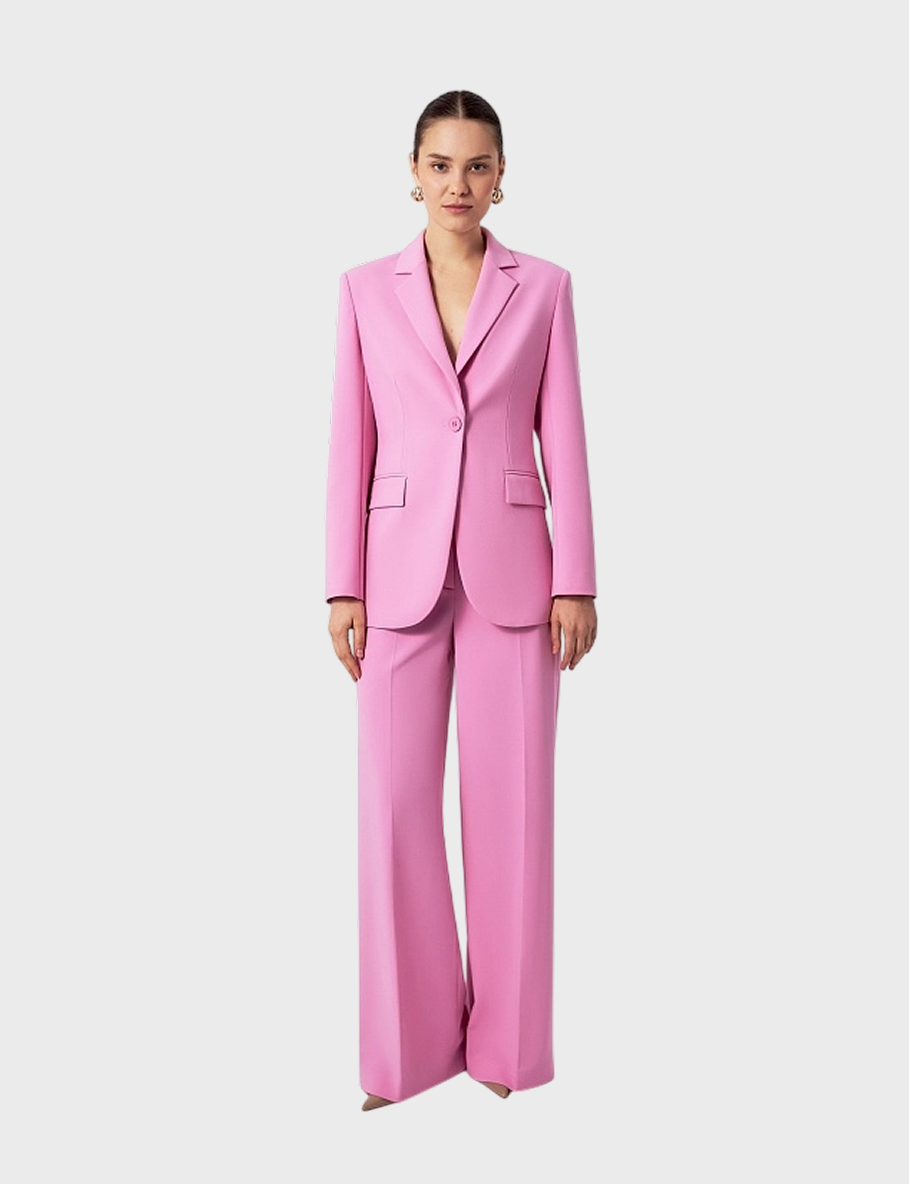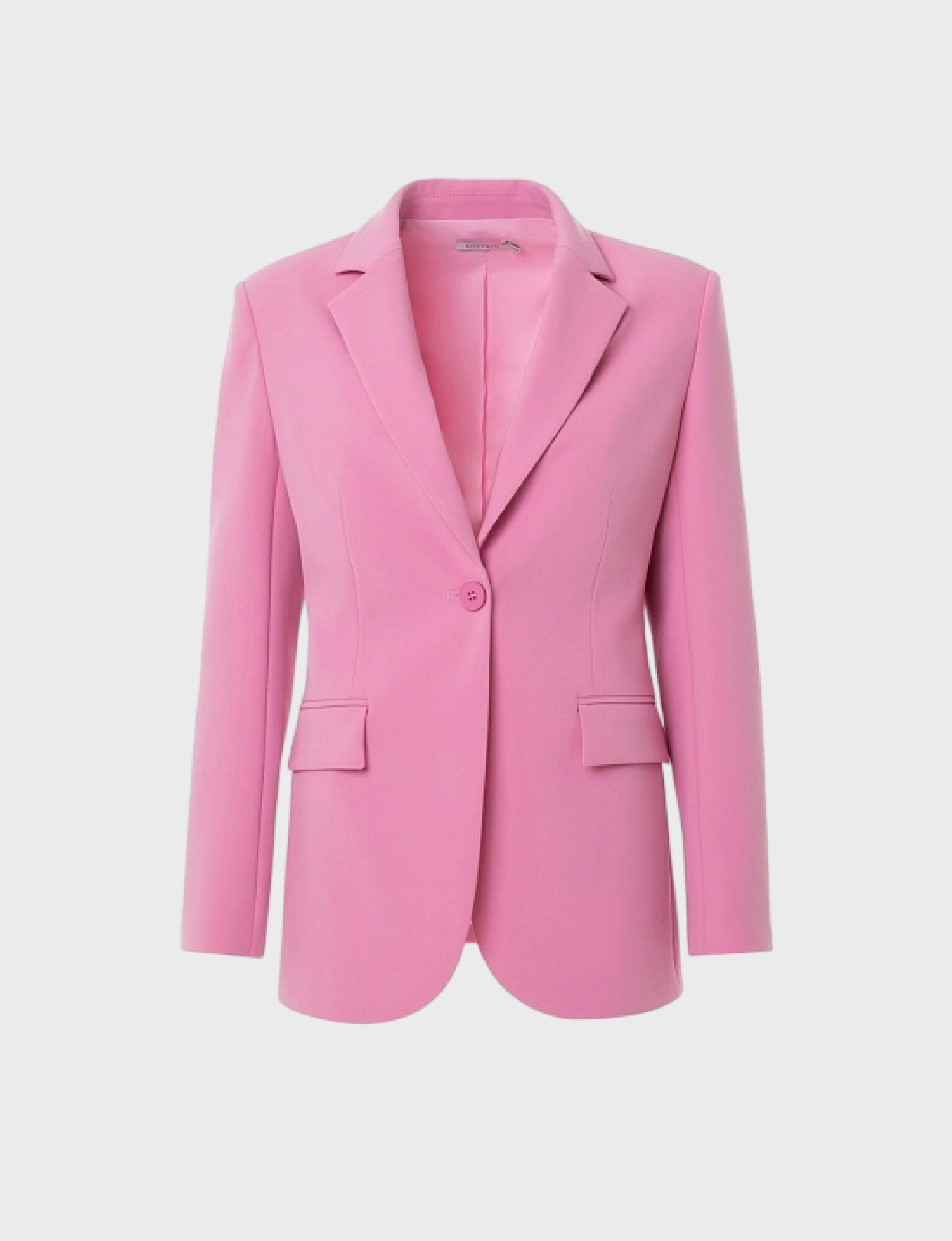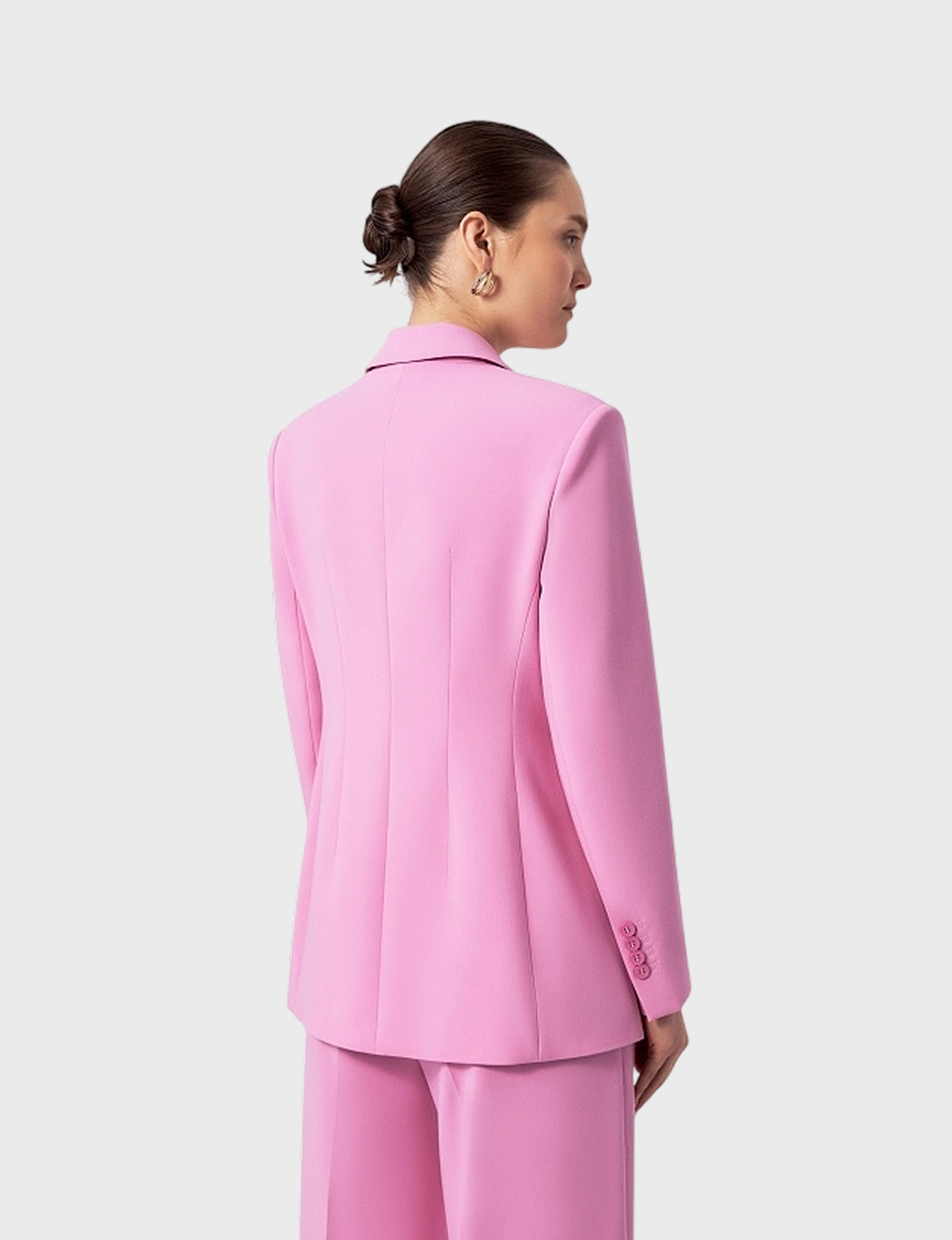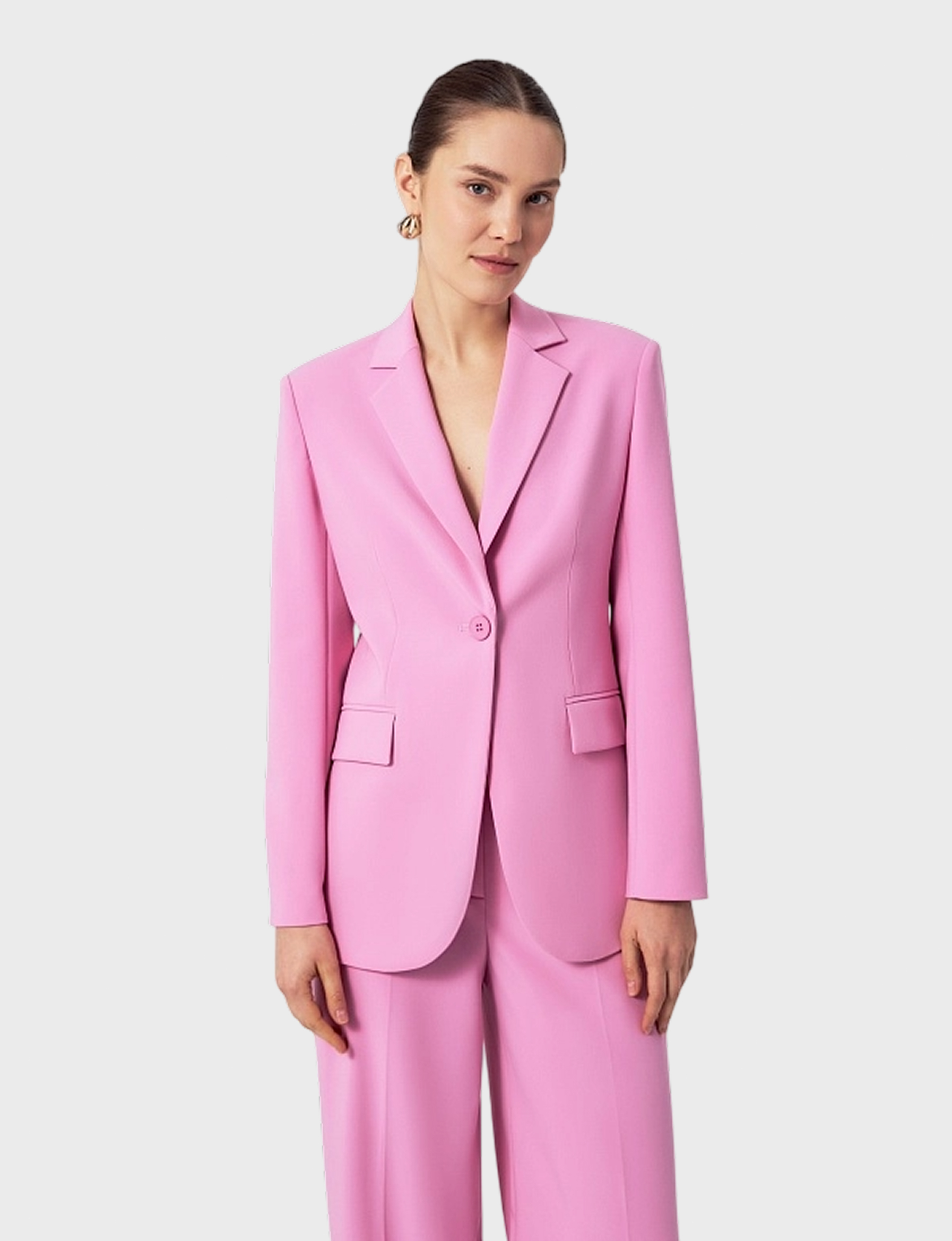 Прилегающий приталенный жакет из вискозной костюмной ткани яркого конфетно - розового цвета. Жакет с английским воротником и закруглённым бортом. Жакет удлиненный на подкладке.