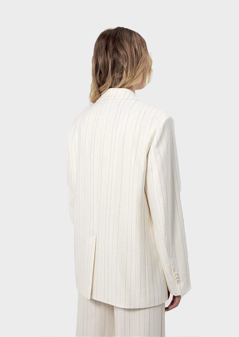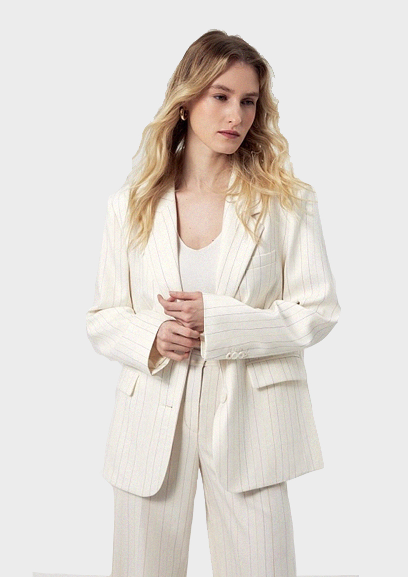 Приталенный однобортный жакет из костюмной ткани молочного цвета с тонкой разноцветной полоской. Жакет с английским воротником на трех пуговицах, на груди листочка и прорезные карманы на полочке. Рукав классический с пуговицами, на спинке шлица. Такой жакет будет отлично сочетается с брюками из одной ткани так и однотонными брюками из молочной ткани.