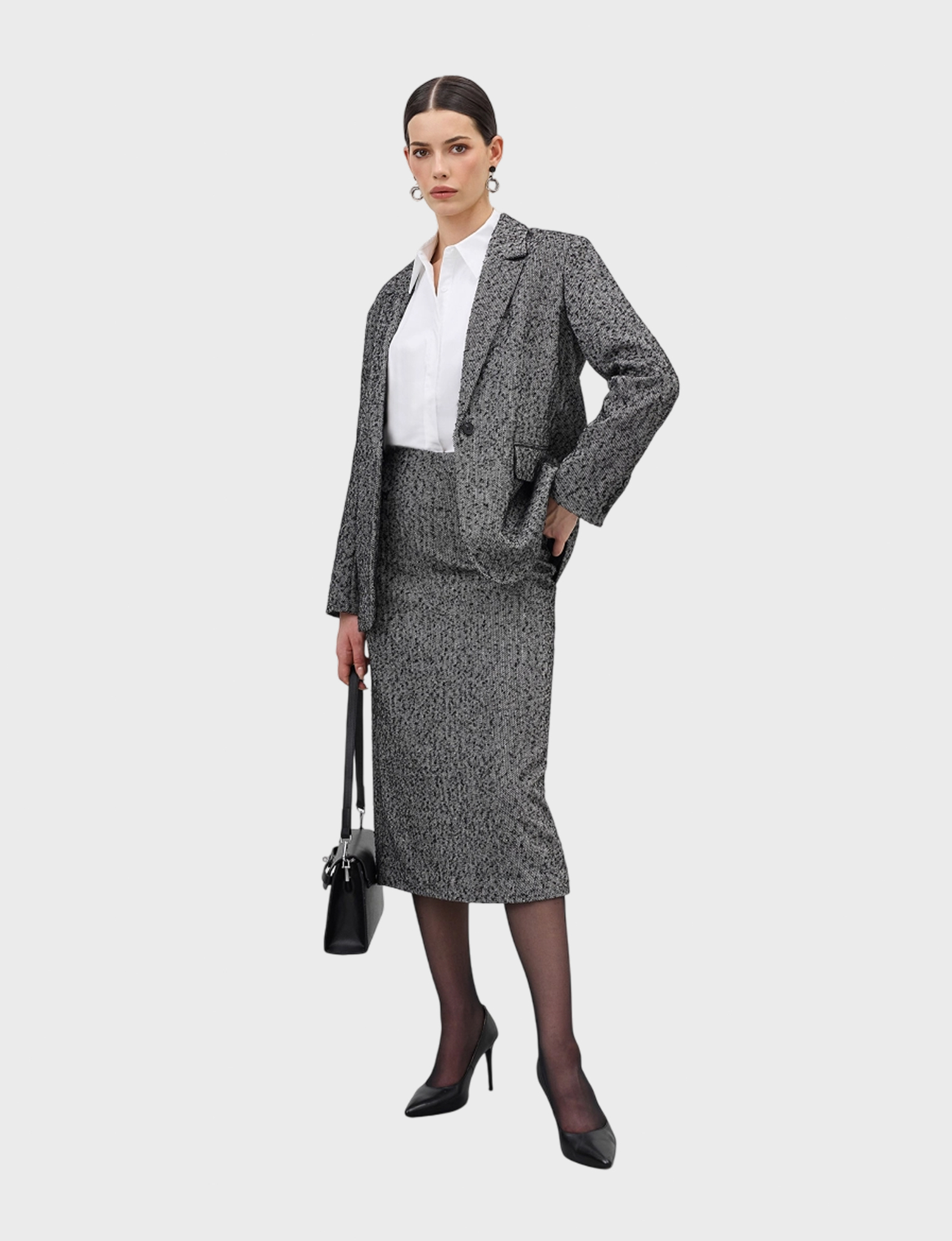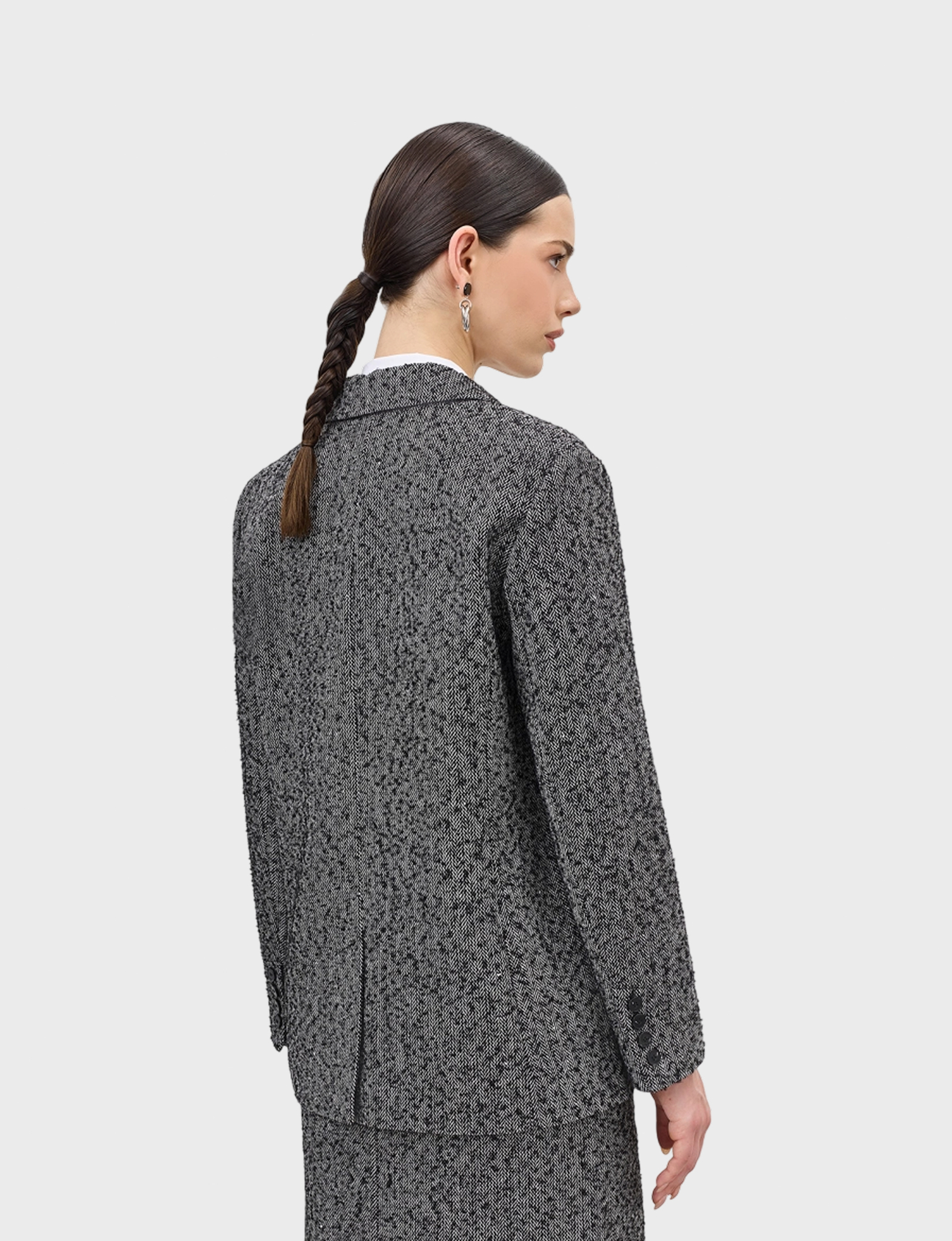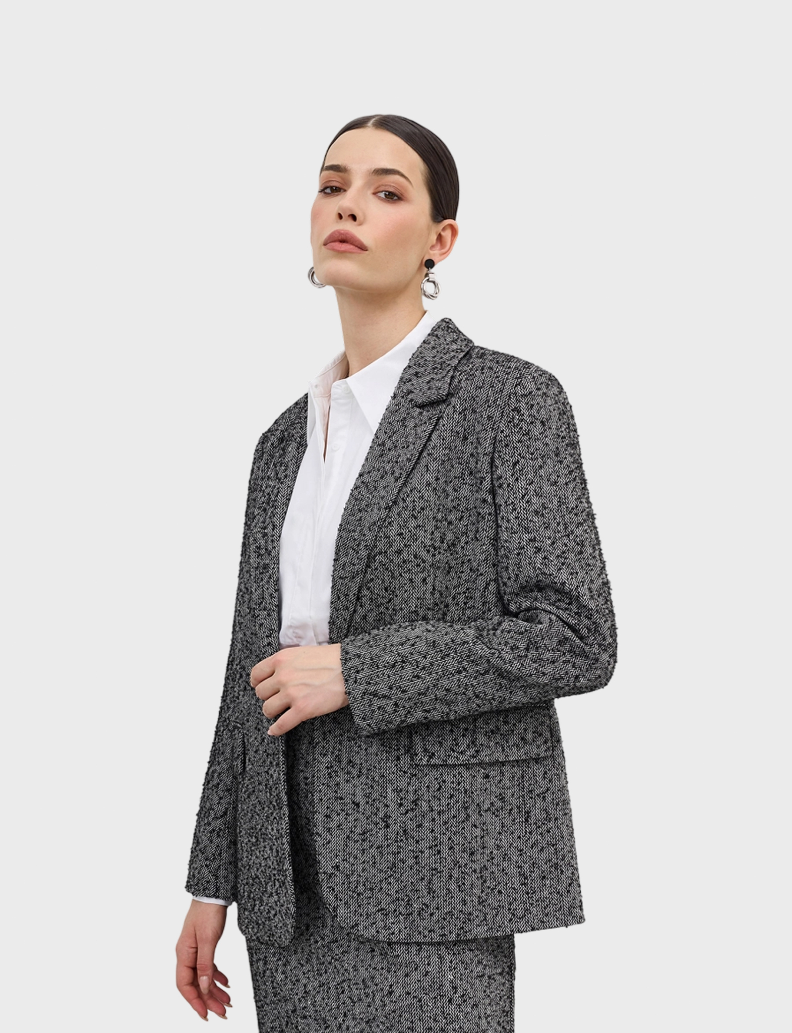 Однобортный жакет из твида с эффектом "букле". Прямой силуэт. Классический английский воротник с лацканами. Застежка на пуговицу. Боковые карманы с клапанами.