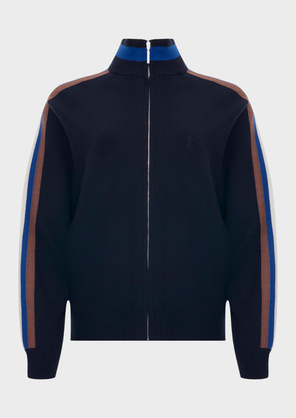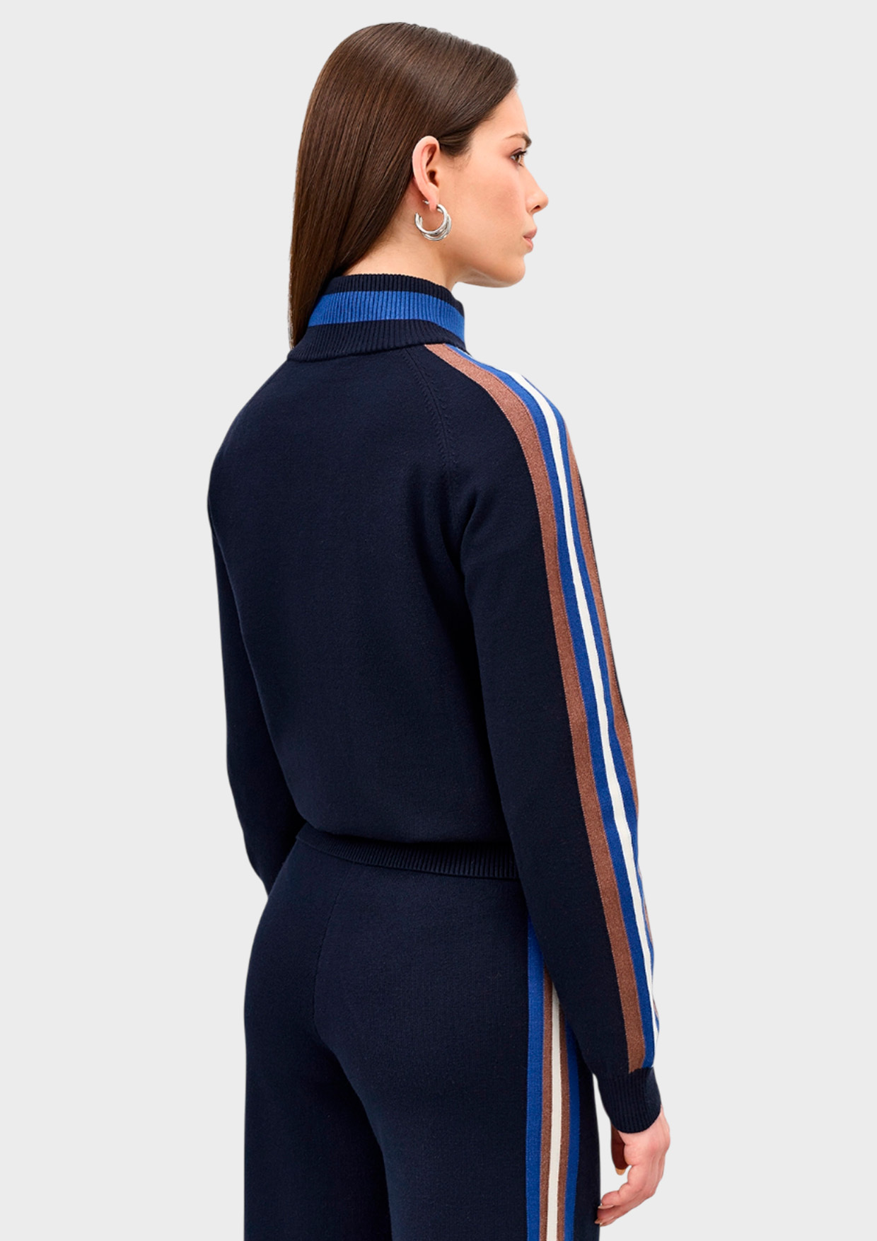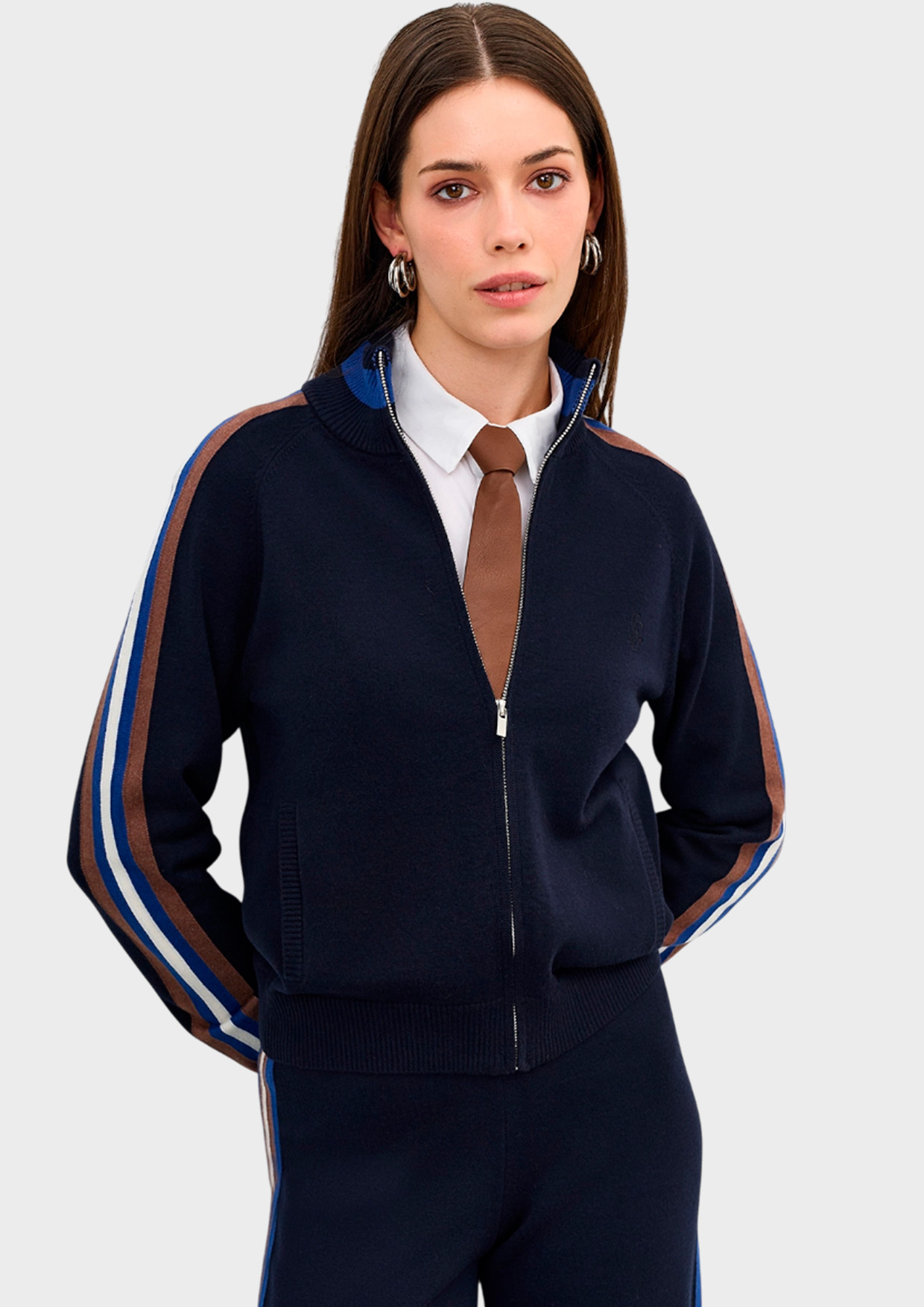 Жакет-бомбер в спортивном стиле с яркими лампасами. Свободный силуэт. Воротник высокая стойка с контрастными полосами. Застежка на молнию.