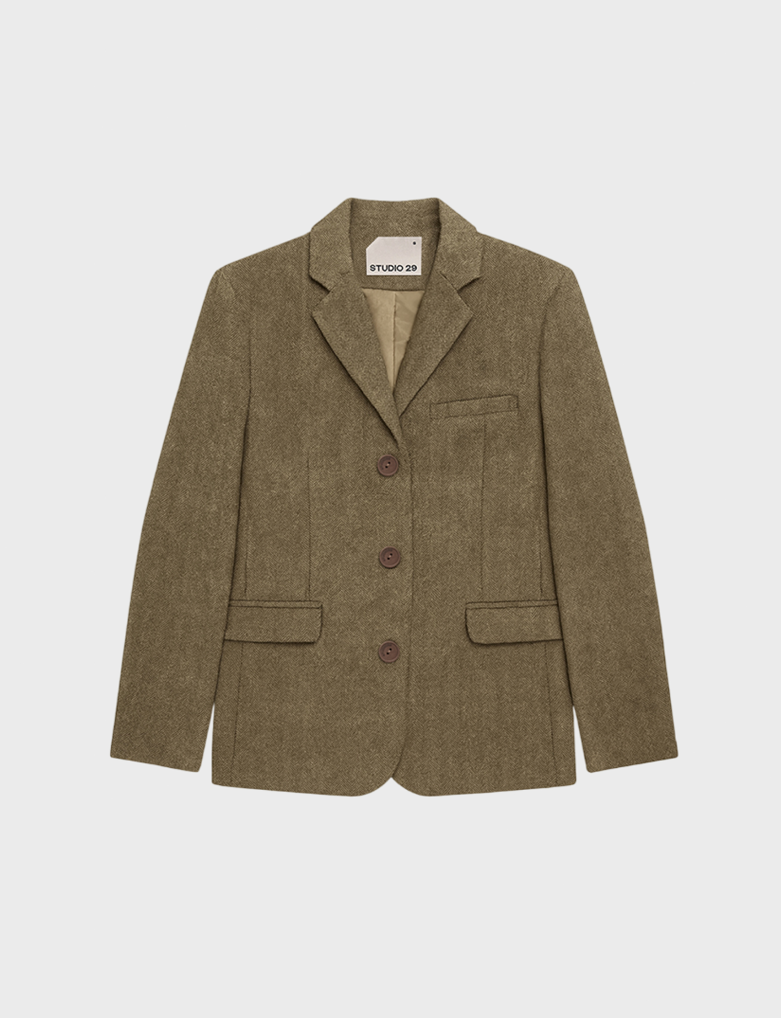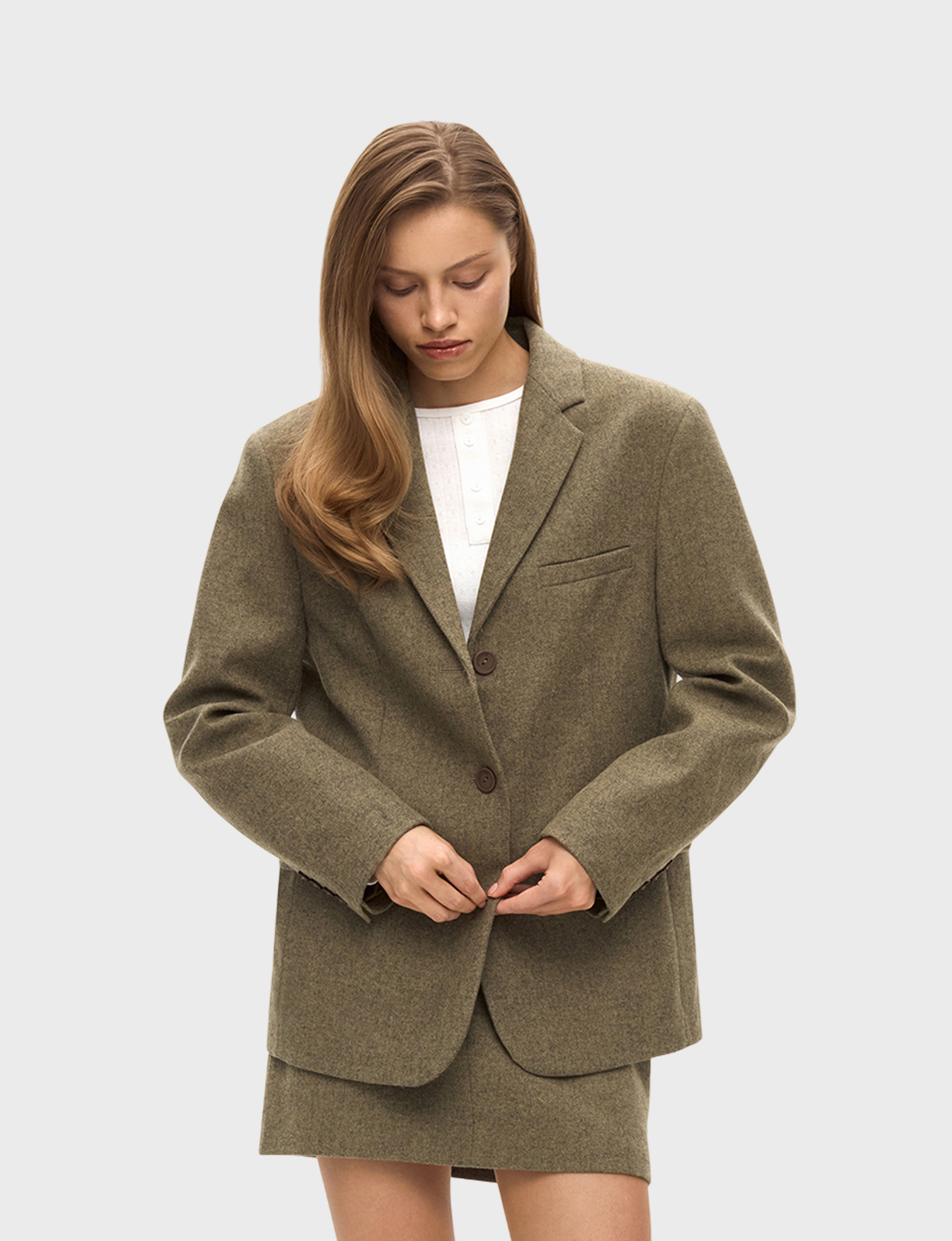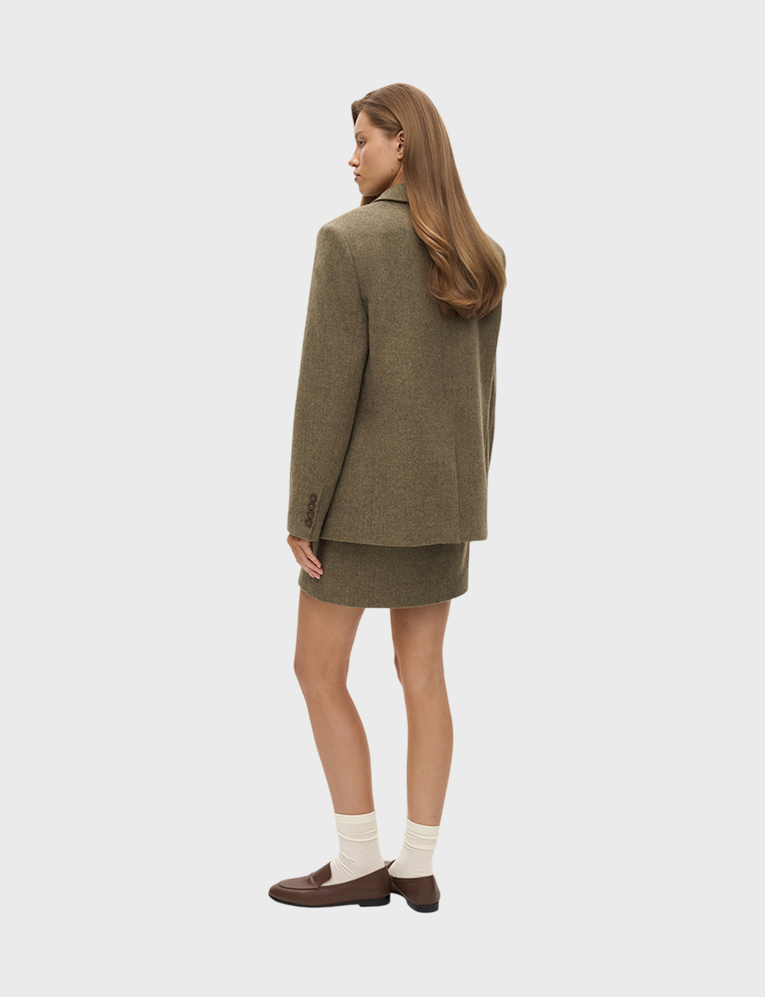 Жакет прямого силуэта из костюмной ткани с шерстью. Посадка расслабленная по фигуре. Ткань имеет выраженную структуру, что делает цвет жакета более сложным. Рукава прямые, по низу со шлицей на пуговицах. Спереди, по низу, имеют мягкую закругленную форму. Застегивается жакет на пуговицы. По переду дополнен карманами с клапаном, нагрудный карман с листочкой. По спинке – шлица, изделие на подкладке. Дополните жакет мини-юбкой из комплекта.