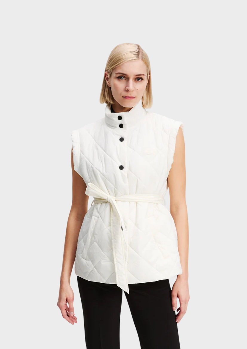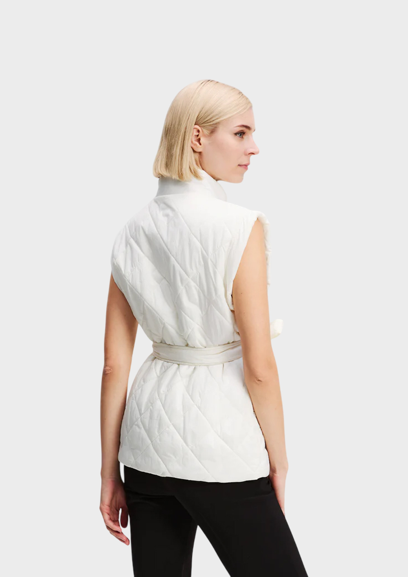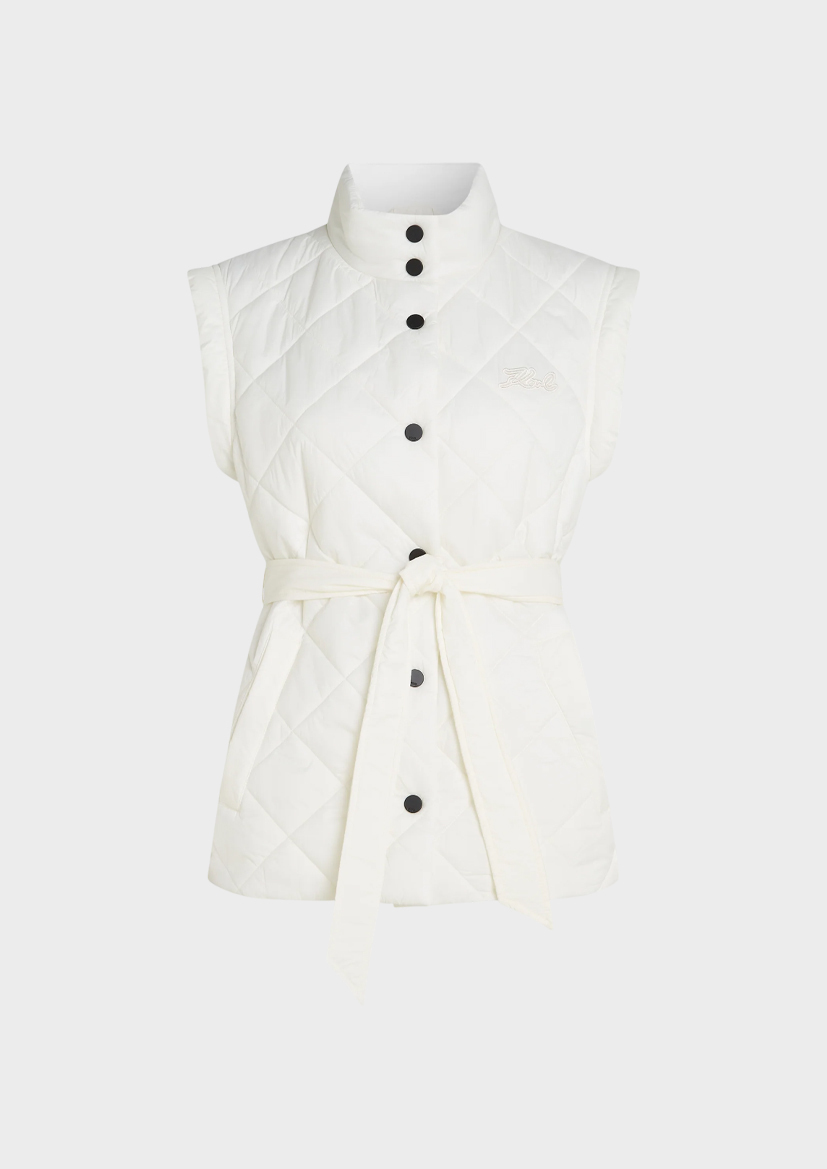 Белый женский жилет от бренда Karl Lagerfeld. Элегантность дизайна подчеркивает статус владелицы, а белый цвет легко сочетается со множеством образов, делая его универсальным элементом стиля.