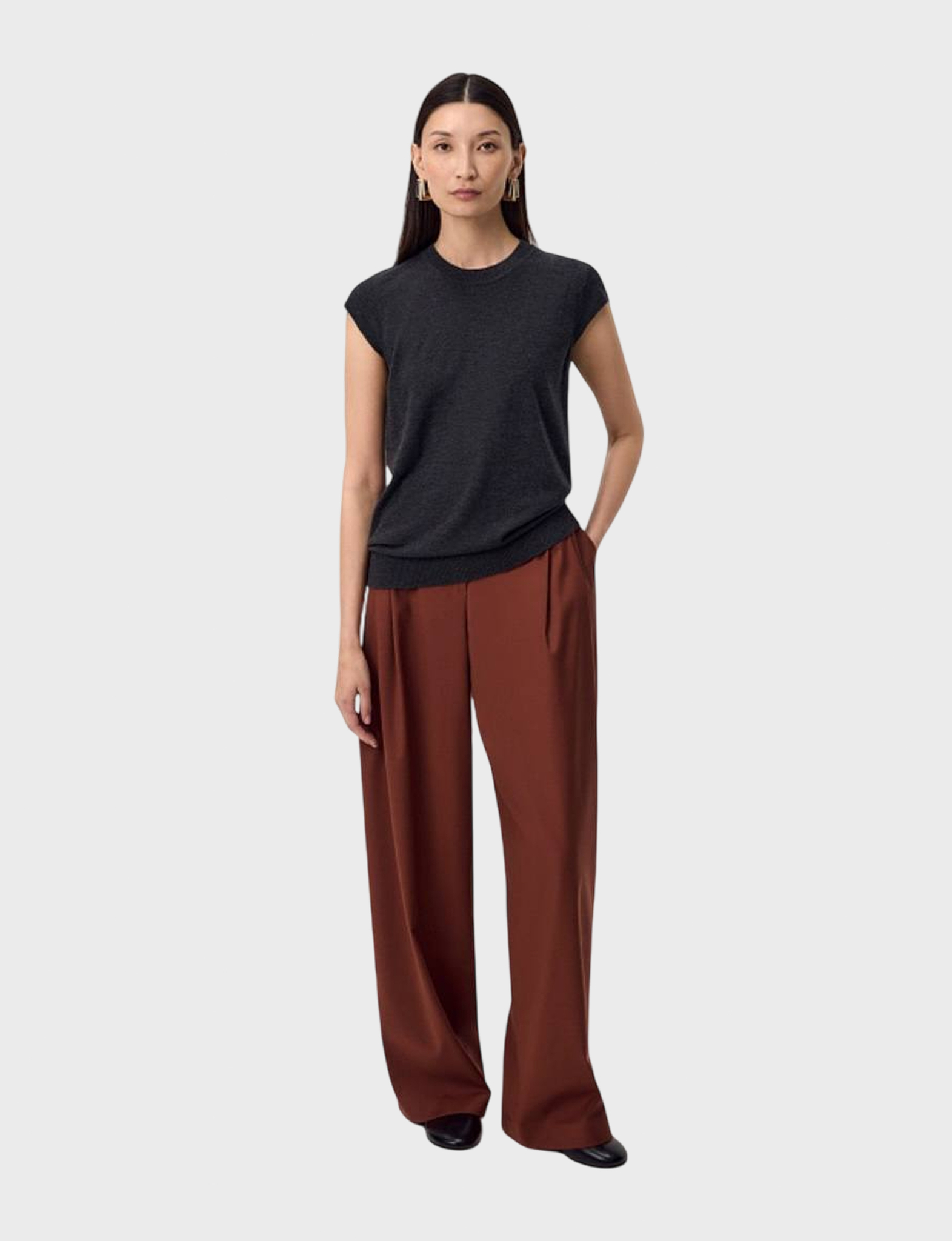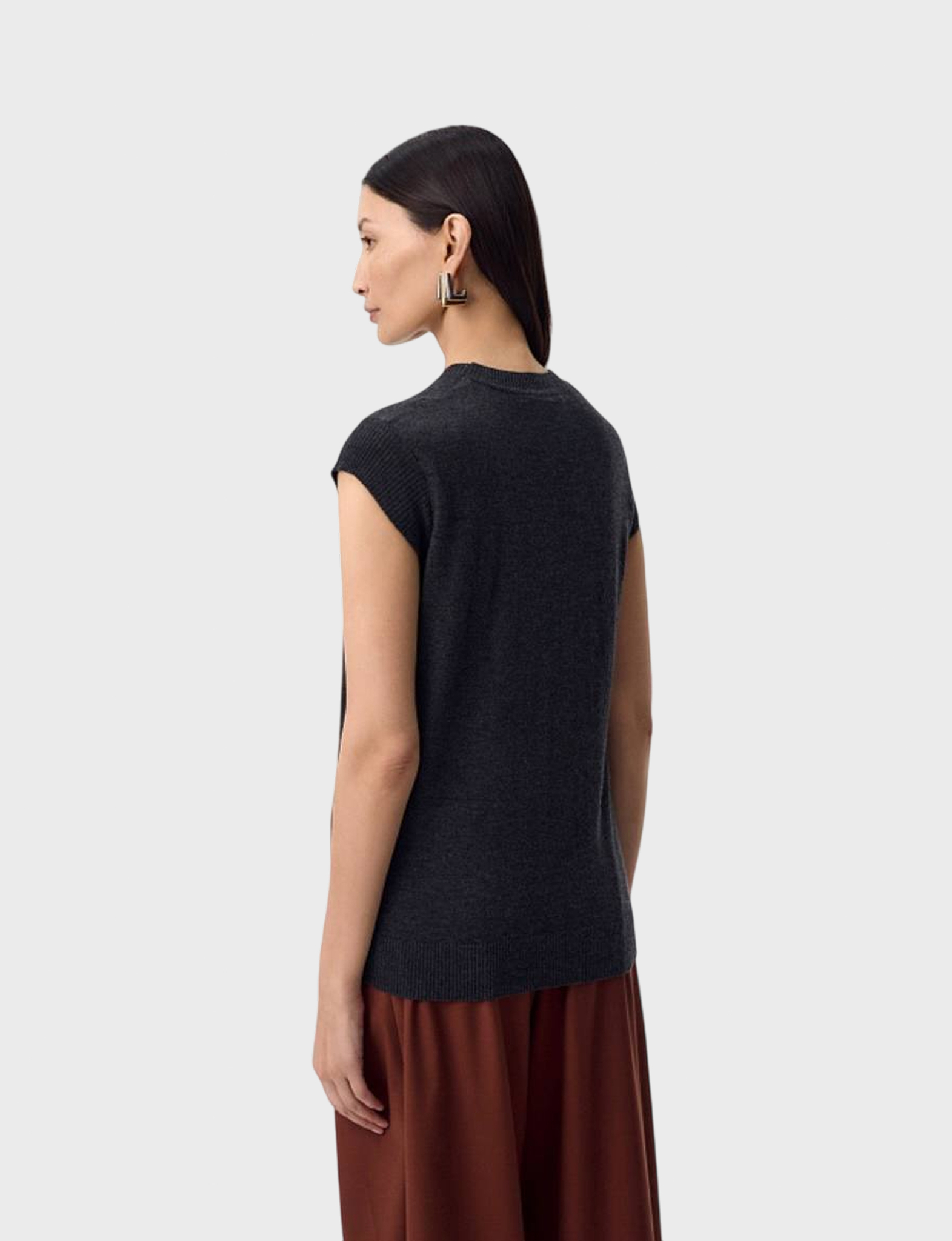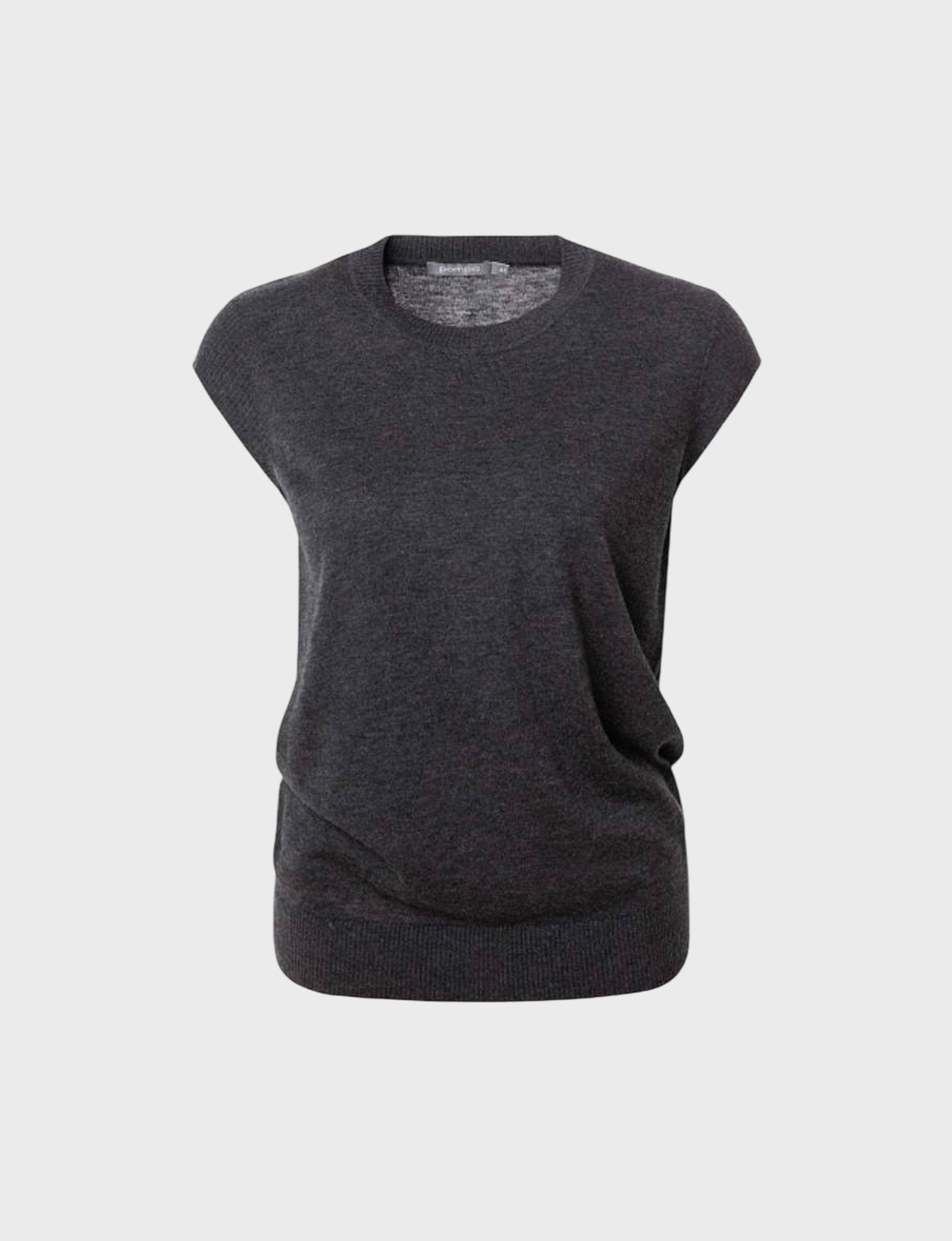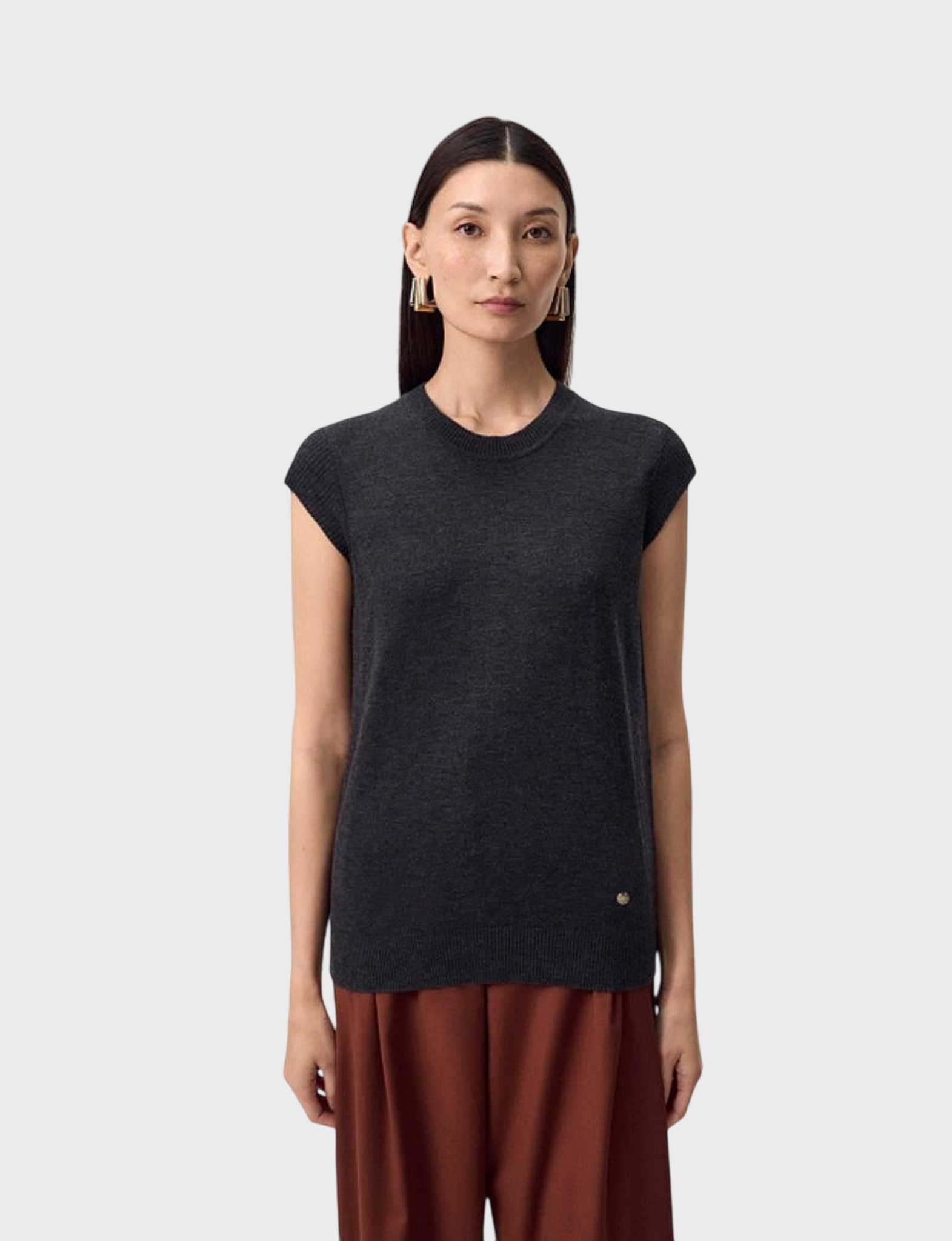 Прямой жилет в цвете серый меланж. У жилета круглая горловина, рукав втачной, короткий, из подвяза. Спереди слева круглый металлический декор.